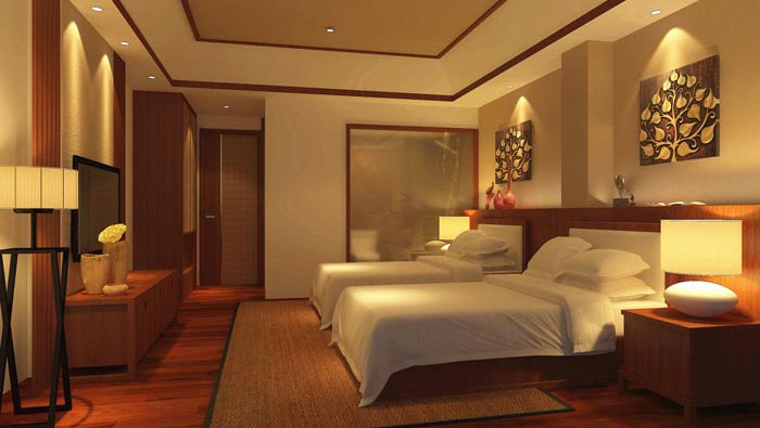 雙人間的設計:在雙人間的設計上面,設計師認為最重要的就是完善各自之間的距離,因為兩個人與一個人總歸是有很大的不同,在這里床的位置十分重要,因為既不能突出那個,也不能忽略哪一個,所以空間的平衡非常重要,這就要求設計師在設計中,需要對格局進行不斷的調整與嘗試,目的就是希望達到一種動態的平衡。