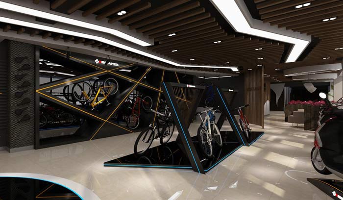 設計理念:設計師是首次接手自行車、電動車在一起的專賣店裝修設計,在設計之初和業主進行了深入的交談,不管是電動車展廳還是自行車展廳,在設計的時候,都以透出各自的特點為首要條件,通過設計襯托出電動車和自行車不一樣的風格。