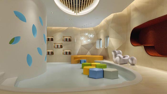 閱讀池的設計:此處位于空間的正中央,整個閱讀池或坐或躺,既可以滿足孩子的閱讀,也可以讓孩子在此處玩耍,同時保證孩子的安全,階梯狀的座椅讓孩子可上可下,可以鍛煉孩子的獨立自主,同時此處可以欣賞到整個空間的景色,在此處本身就是一種享受。